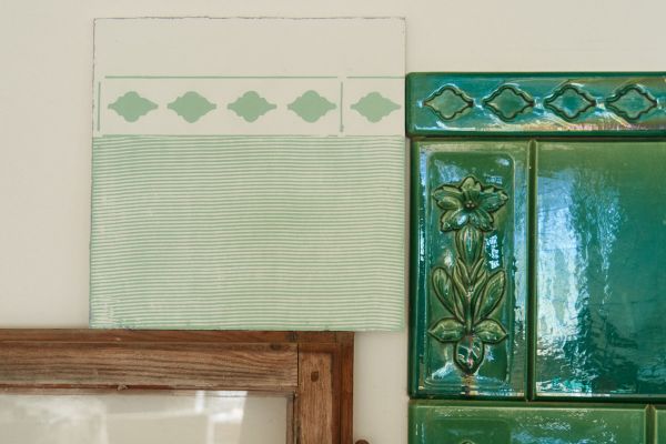 Wir haben aus einem reinen Leinenstoff eine Wandverkleidung hergestellt, indem wir die Stoffbahnen in wellenförmige Falten gelegt haben. Die Stoffbahnen haben wir mit warmem Hasenleim an die Wand appliziert.